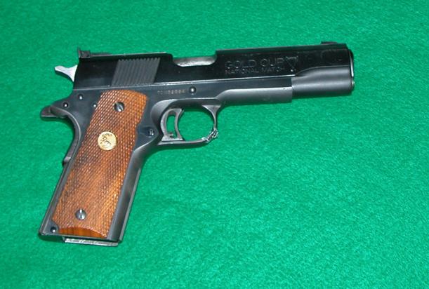 | Item # LAMP003 - Colt National Match Gold Cup 1911A1 45ACP - $600 Excellent condition Gold Cup, very little use. Area on the front of the trigger guard is just tape applied by match officials to indicate that guns had been checked for proper trigger weight. Tape has been removed since this photo was taken and there is no marring of the finish. |