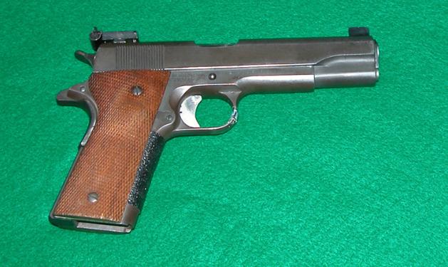 | Item # LAMP005 - Accurized 1911A1 built for mid-range 45ACP - $350 Very nice condition 1911A1. Built up for mid-range wadcutter 45 ACP, excellent shooter, very accurate at 50 yards. Area on the front of the trigger guard is tape applied by match officials to indicate that guns had been checked for proper trigger weight. Tape has been removed since this photo was taken and there is no marring of the finish. |