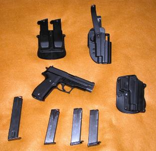 | Item # PRV021 - Sigarms P226 - 9mm -- complete package $695 Excellent condition, includes six preban magazines, (two original Sig 15 round, one original Sig 20 round, three OEM 18 round), one paddle level 1 holster, one belt level 2 holster, one paddle double magazine holder. Firearm shows minor holster wear, perfect in all other respects. Not shown but also included is original box, paperwork and instruction manual. |